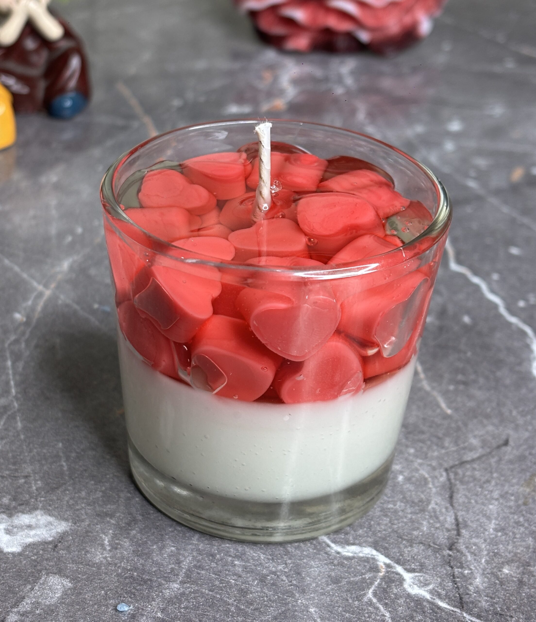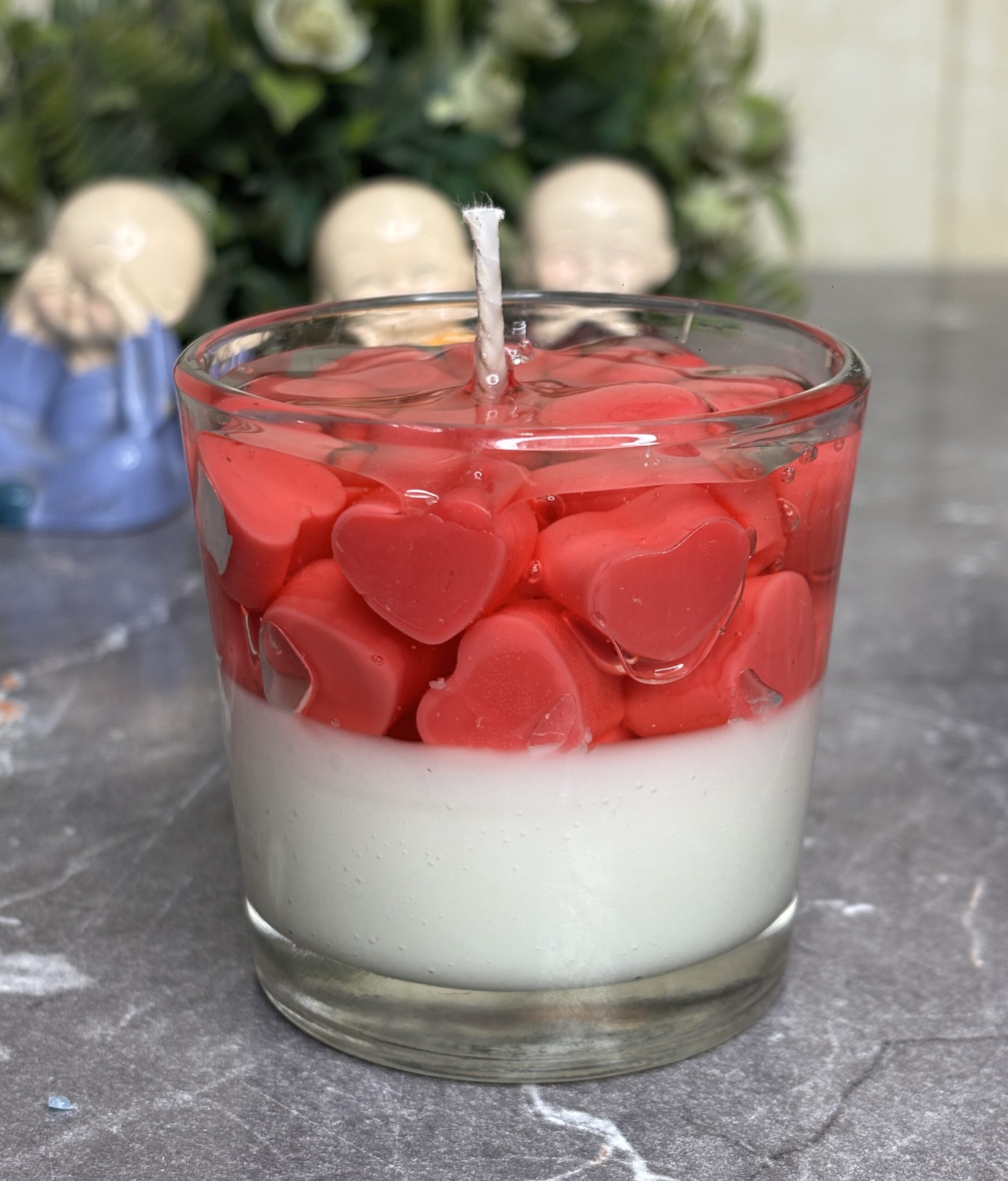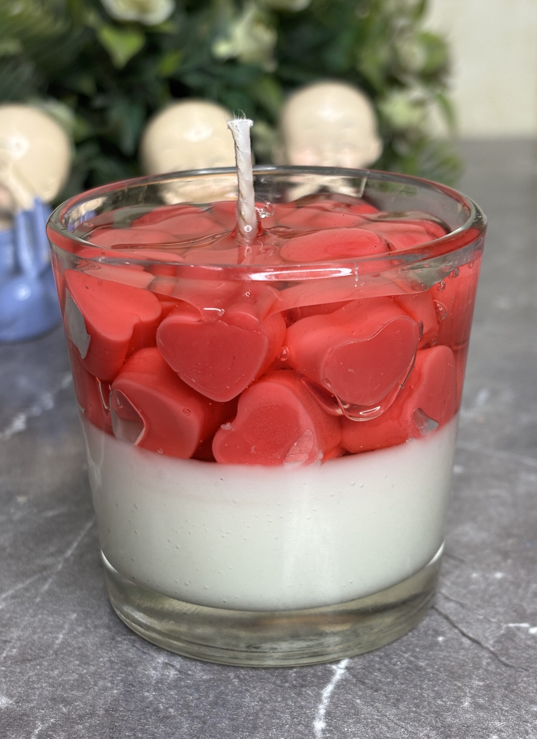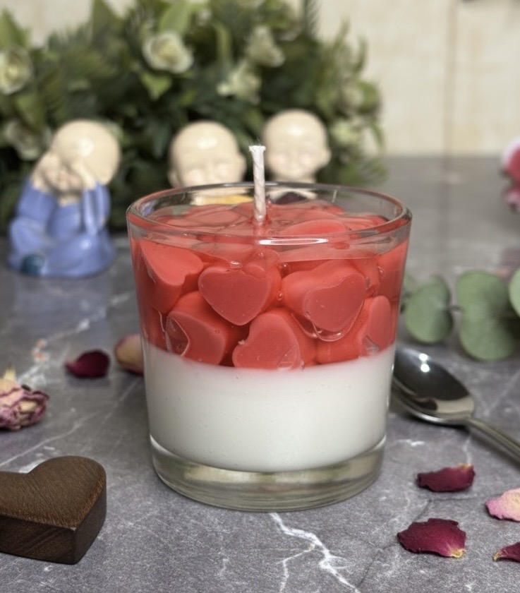 Celebrate love in its purest form with our Hearts in Bloom Gel Candle. This unique jar candle features a creamy white wax base, topped with a crystal-clear gel layer that holds dozens of vibrant, hand-molded red hearts. It’s a visual representation of love and affection, designed to bring a warm, romantic glow to your home.