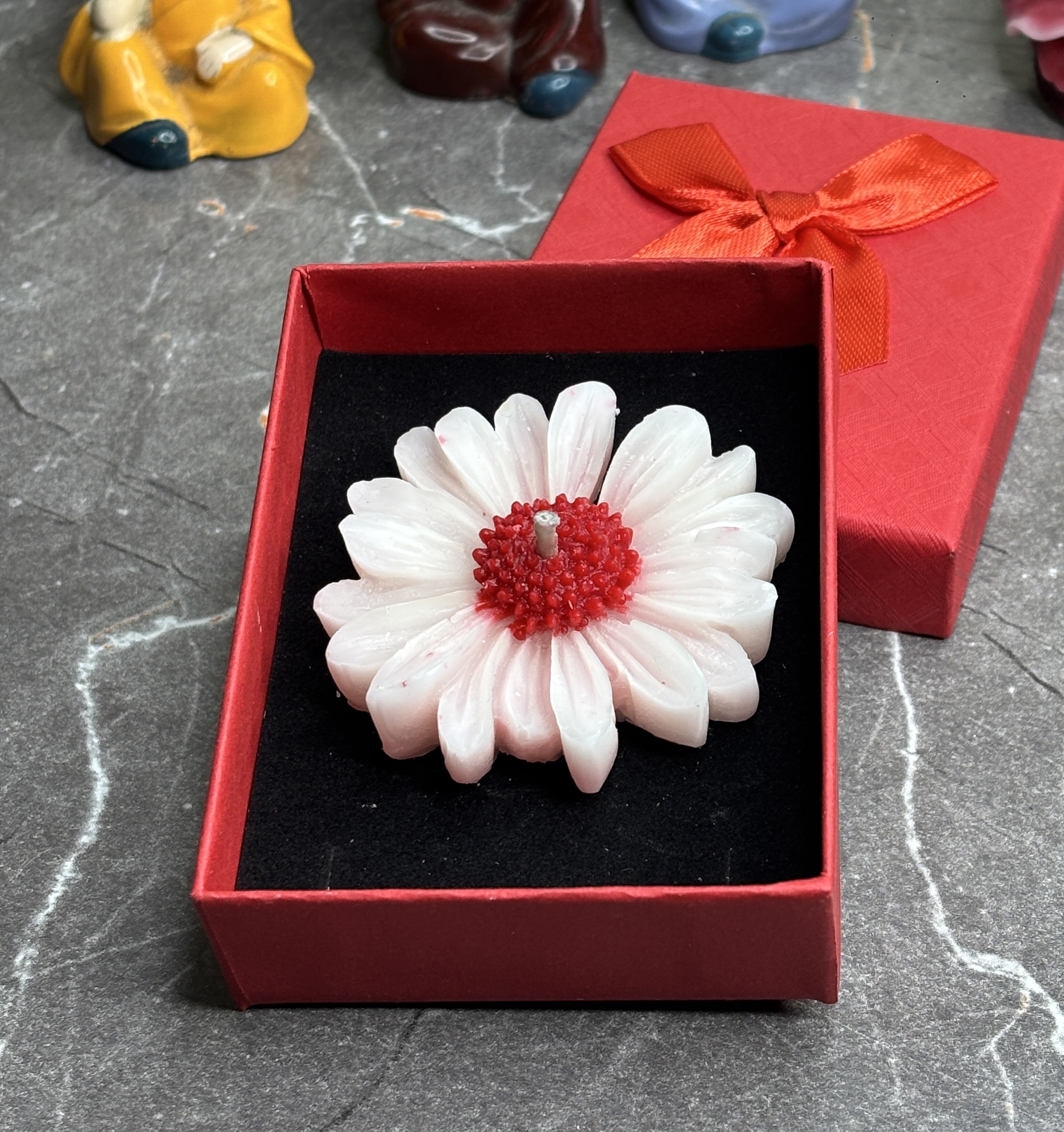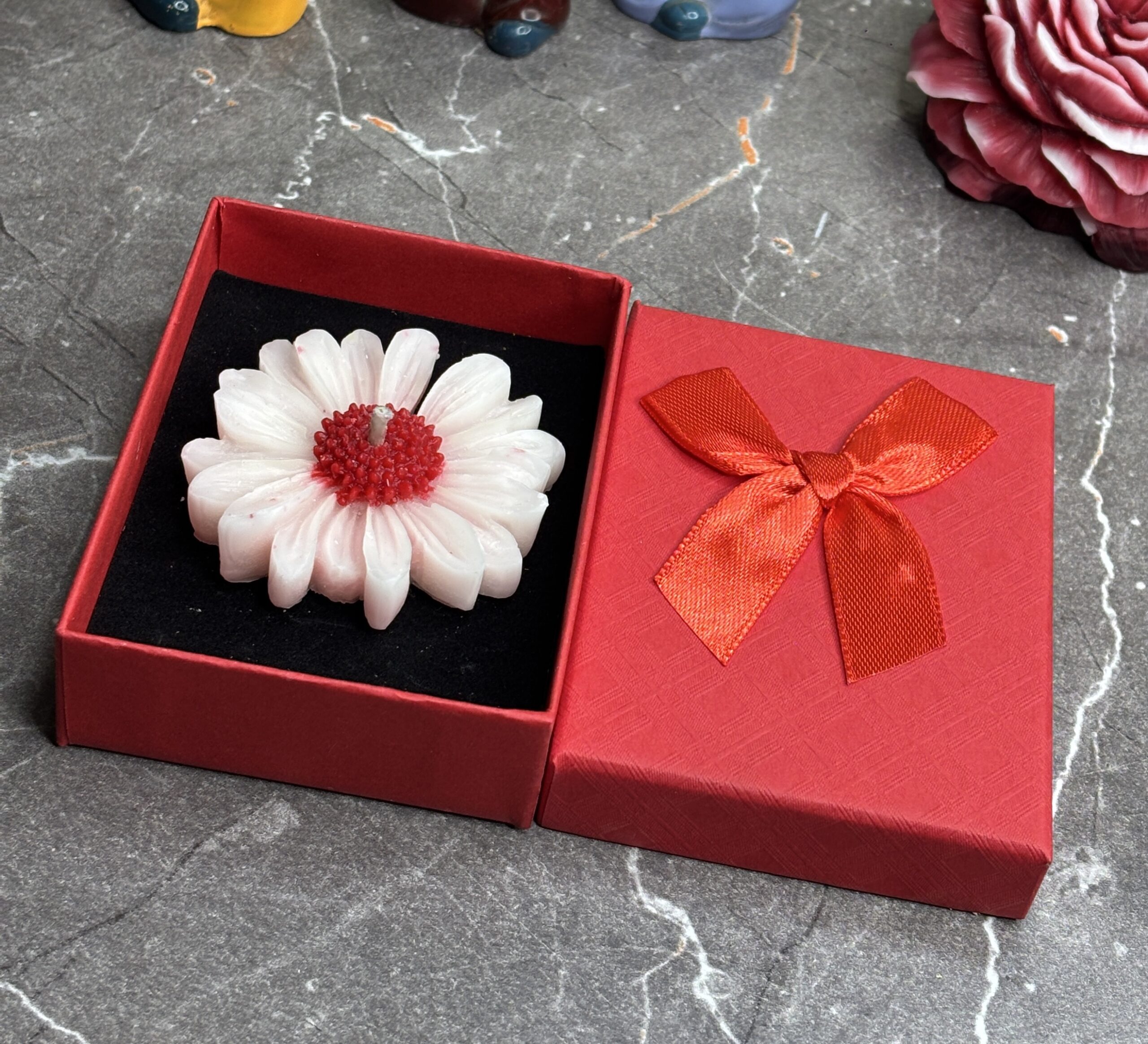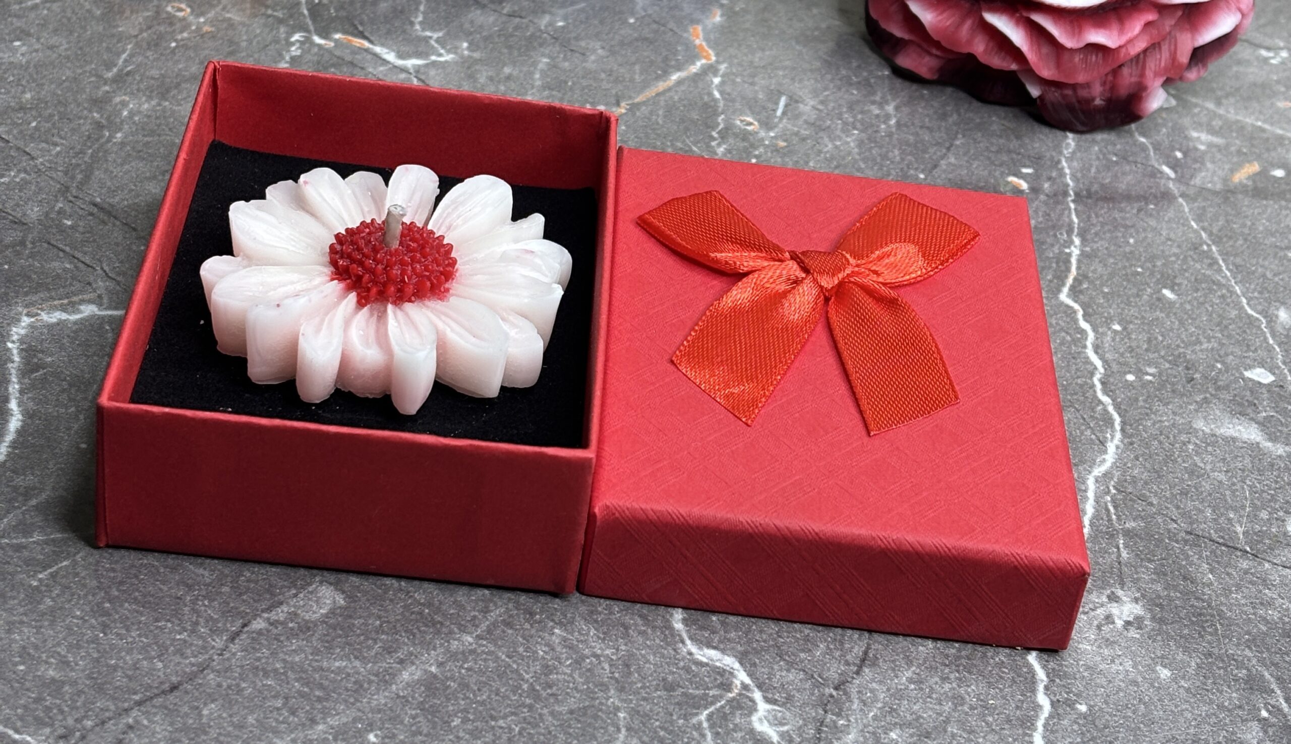Apne gifting andaaz ko ek naya mod dein hamari Velvet Petal Daisy Candle ke saath. Yeh candle ek beautiful white daisy ki tarah design ki gayi hai jisme ek vibrant red center hai, jo ise ek real flower ka look deta hai. Ise ek premium red gift box mein black velvet base par rakha gaya hai, taaki yeh unboxing ke waqt bilkul ek luxury jewelry piece jaisa lage.