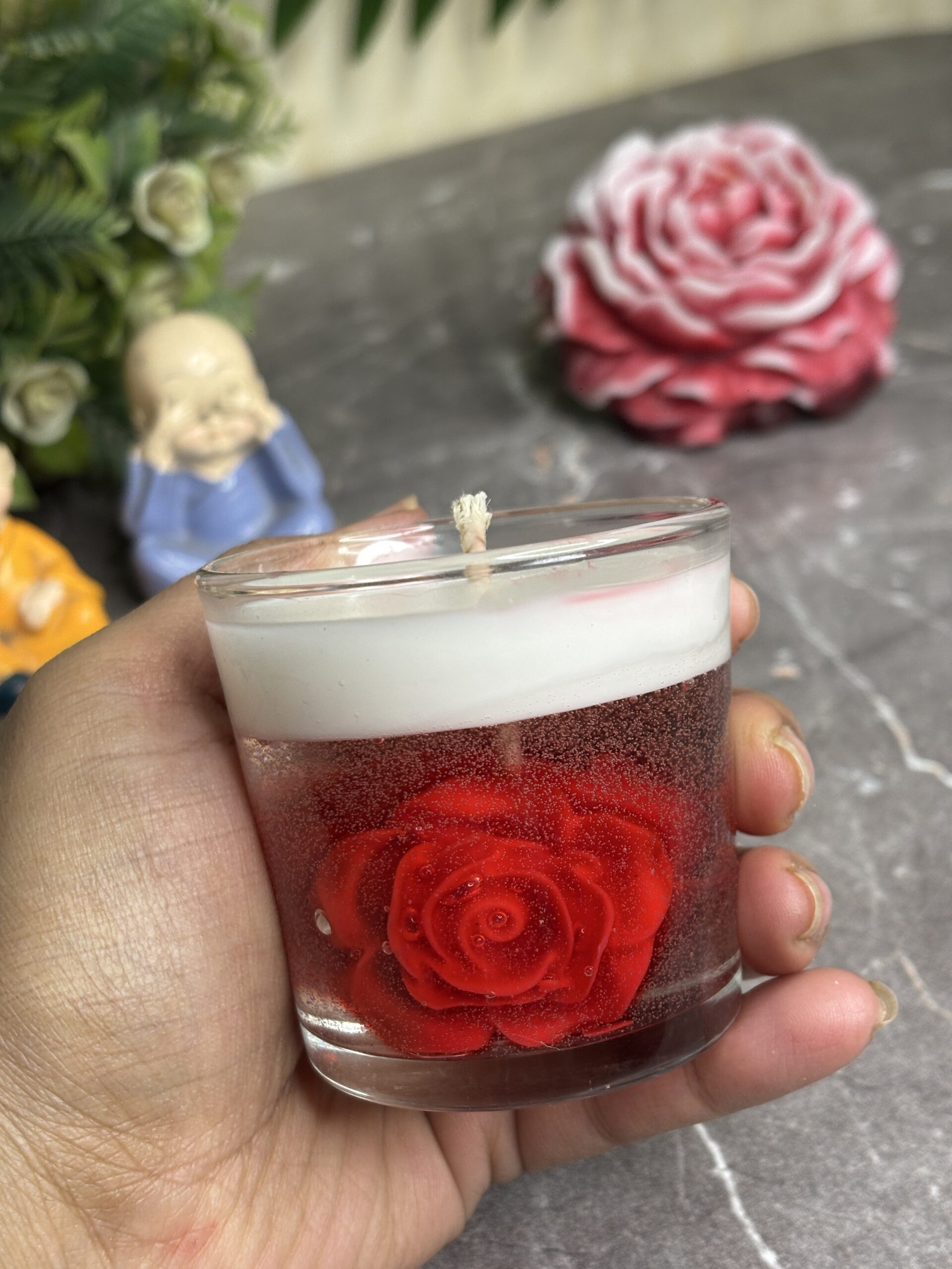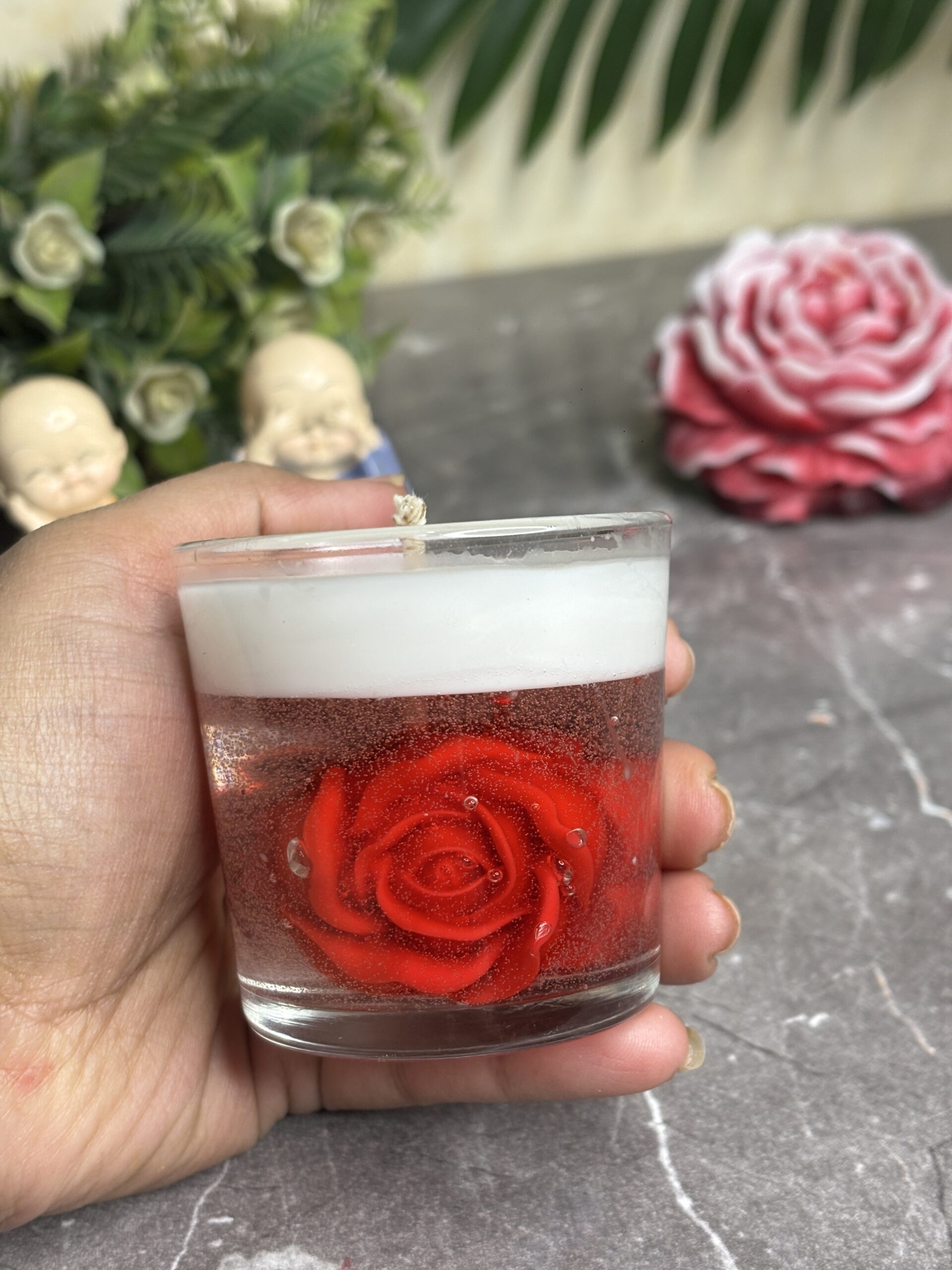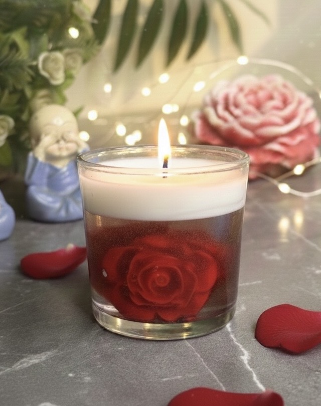 Experience the magic of eternal spring with Royal Preserved Rose Votive Gel Jar Candle. This exquisite candle captures the beauty of a single, vibrant red rose suspended in crystal-clear gel. With subtle bubble particles floating around the bloom, it creates a whimsical 3D effect of a flower preserved in time. Topped with a clean white wax layer, this candle is the ultimate fusion of modern design and classic romance.